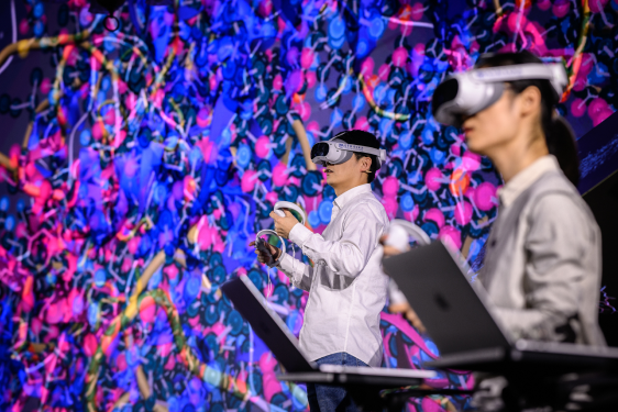 背景大屏、立方体屏、VR穿戴设备与科学可视化内容、虚拟仿真系统的软硬件配合,体现了未来学习中心物理空间与数字空间融合的特性。